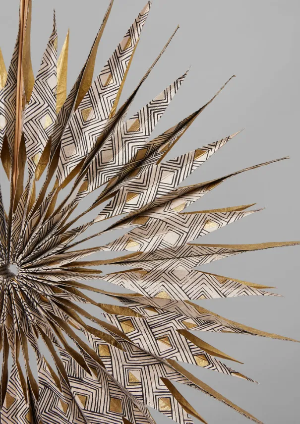 Pleated hanging paper star made with hand-printed paper. Crafted by artisans in the Kathmandu valleys from Fair Trade paper made from fibres from the evergreen lokta plant, which grows in abundance in the forests of Nepal and regenerates into a fully grown plant in just over five years. With a hanging loop, packaged in a small box also made from Nepalese lokta papers. Keep away from fire. Details Handmade Lokta paper.Made in Nepal.Approx. D 35cm.