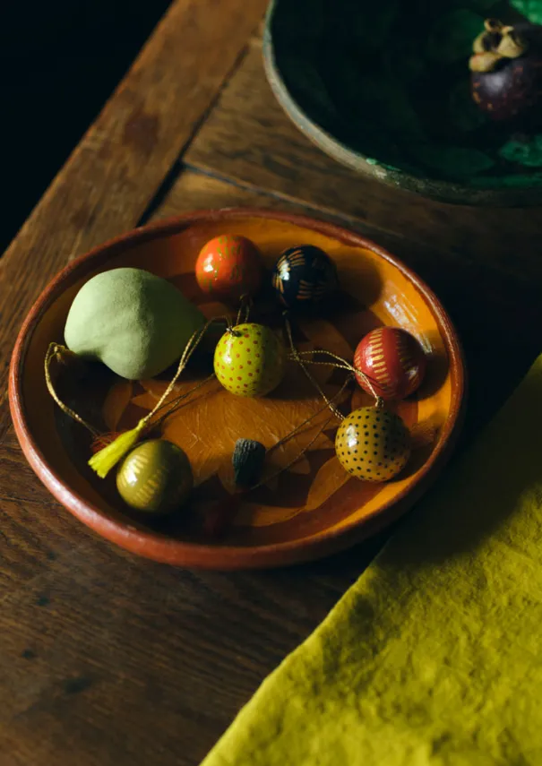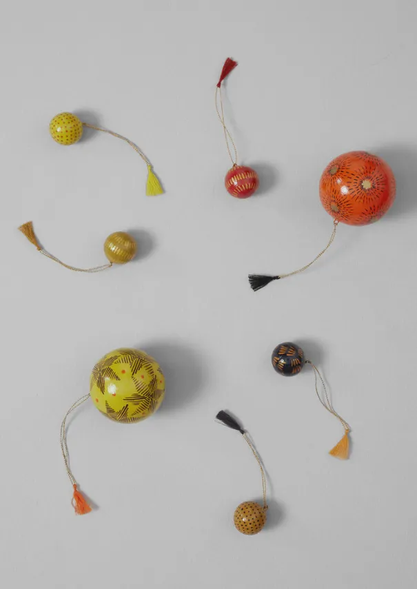 Set of six mini papier-mâché baubles hand-painted with unique patterns designed by TOAST, by artisans in the Himalayan valleys of northern India. They are supported by Fair Trade cooperative Sasha, which TOAST has worked with for over ten years. Handmade from recycled newspaper and finished with a small tassel on the end of the hanging loop. Accompanied by a block-printed cotton bag made from fabric left over from previous TOAST collections, making each unique. Details Papier-mâché. Cotton bag.Made in India.Made in India by small groups of men and women who work in collaboration with a fair trade organisation that supports them in business and marketing. Being hand made, no two are the same.Approx. D 3cm each.