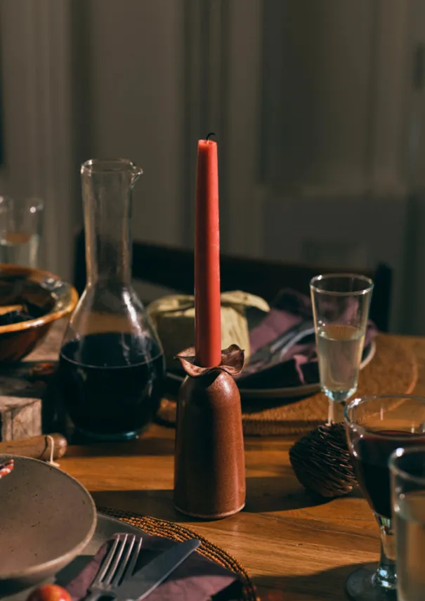 Vase handmade in east London by Emma Szkolar at SZ Ceramics, who takes her inspiration from nature. Hand thrown on the wheel and then the rim is hand pinched into a wavy edge. Coated in a matt chestnut glaze, with variation in the glaze colour from one vase to the next. Can also be used as a dinner candle holder. Details Hand wash. Stoneware.Made in the United Kingdom.Each ceramic piece has been thrown or pressed and glazed by hand. Due to the handmade nature, there may be pleasing variations and irregularities in colour, size and shape.Approx. H 15.5cm x D 6.5cm.