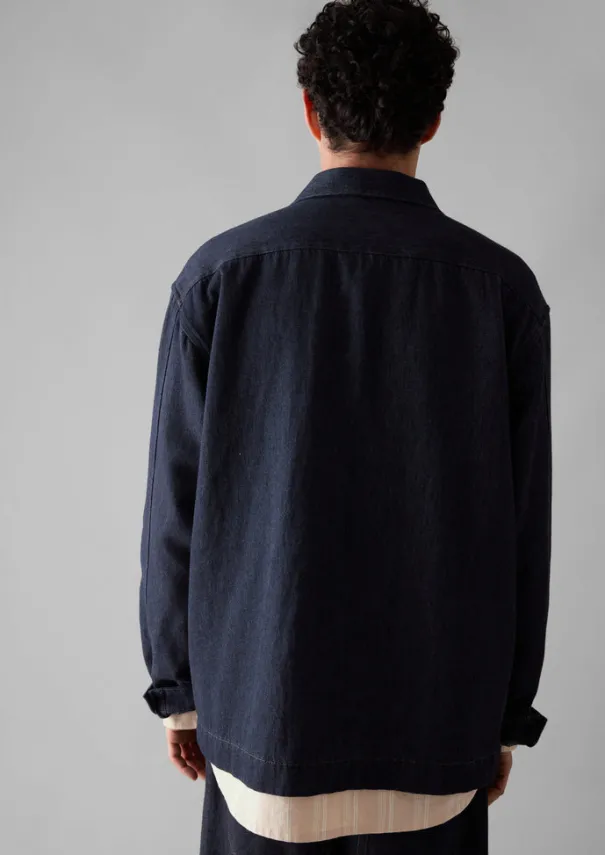 Our denim popover shirt has a smock collar complementing the relaxed feel of the style. Crafted from a hemp and cotton-blend fabric. Part of our Menswear collection. Hemp and denim cotton blend. Smock collar with loop closure. Chest patch pocket with contrast stitch detail. Corozo buttons. Details Machine wash 30ºC. 91% cotton, 9% hemp. Made in Turkey.There may be some colour rub, so please keep away from light coloured fabrics and upholstery. Size & Fit Oversized. Length: Low hip. Sleeve: Full sleeve length.Studio model Dylan is 6ft 1in/186cm tall and wears a size M.