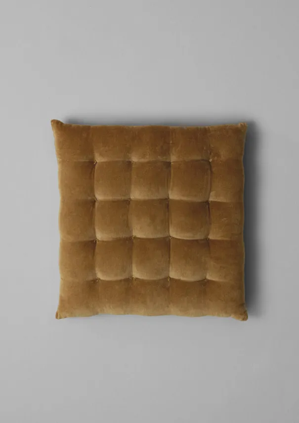 Comfortable chair cushion with a soft cotton velvet front and natural, undyed linen back. Filled with comfortable cotton wadding and finished with hand-knotted quilting. For dining chairs or as you will. Details Dry clean only. Back: 100% linen. Front: 100% cotton velvet. Wadding: 100% mixed fibres. Made in India.The fibres of this item are delicate. Please do not iron directly. We recommend you steam inside out to remove creases. Water or liquid stains will damage the pile. Please shake moisture off rather than blot stains and leave to dry naturally.40 x 40cm