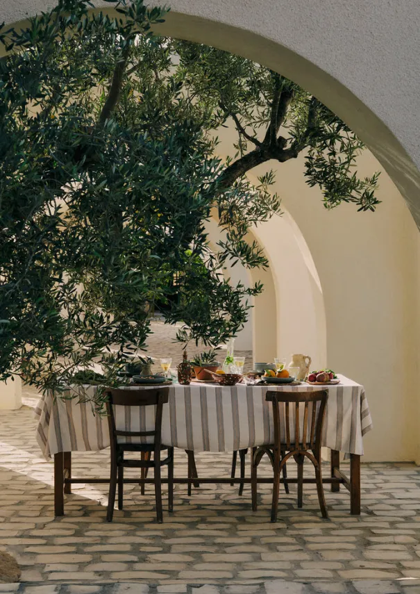 Off-set weft stripes pattern our weighty tablecloth, handwoven from a soft cotton blend by artisans in West Bengal. Woven in two sections due to the width of the loom, then hand-stitched together in the centre with a decorative herringbone stitch. Finished with selvedge edges. Details Machine wash 40ºC. 94% cotton, 6% viscose. Made in India.This fabric is handloom woven. Weaving irregularities are a pleasing characteristic of handloom woven items and should not be considered a fault.240cm x 150cm.