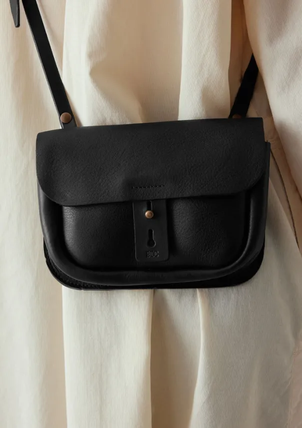 Mini workwear bag crafted by Bleu de Chauffe in a workshop in Millau, France from full-grain vegetable-tanned leather sourced in Europe. With a collar button fastening flap that opens to the interior and an internal pocket. The leather tanneries Bleu de Chauffe works with treat the water they use during the organic tanning process, purifying it to reduce impact on the environment. Vegetable-tanned leather. Internal pocket. Button fastening. Details Full grain vegetable tanned leather.Made in France.W 20cm x H 16cm x D 4cm. Adjustable strap 95cm – 145cm.