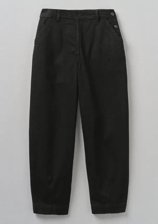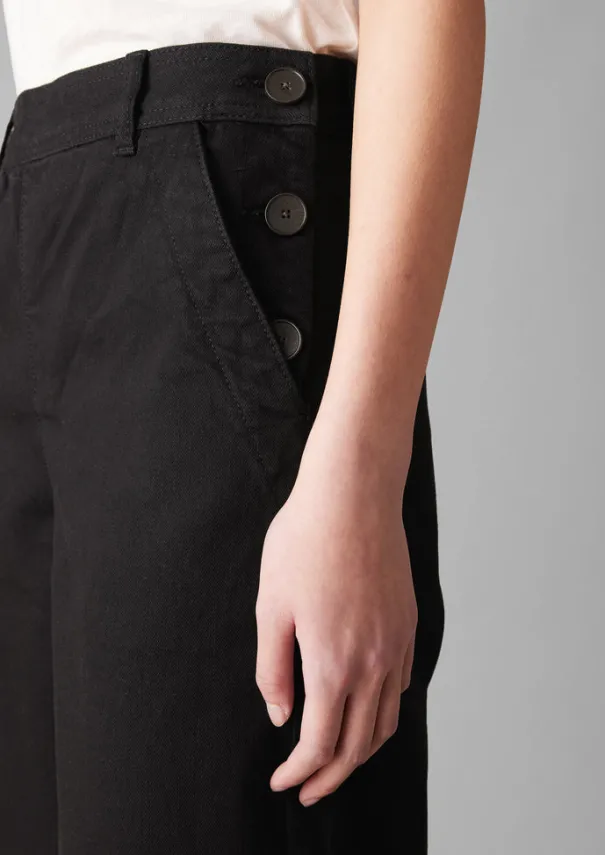 Our trousers are crafted from cotton denim which becomes more supple with each wear. Sitting neatly on the waist with a flat front, falling to rounded long-cropped legs, then finished with a large horn buttons at the side. Cotton denim. Belt loops. Side pockets. Back jet pockets. Long-cropped balloon-shaped legs. Side horn buttons. Details Machine wash 30ºC gentle cycle. 98% cotton, 2% elastane. Made in Turkiye. Black denim will subtly fade overtime with wash and wear. Wash separately inside out for best results. Size & Fit Regular fit. Length: Crop. Waist: Below waist.Studio model Kelia is 5ft 8in/173cm tall and is wearing a size 8.