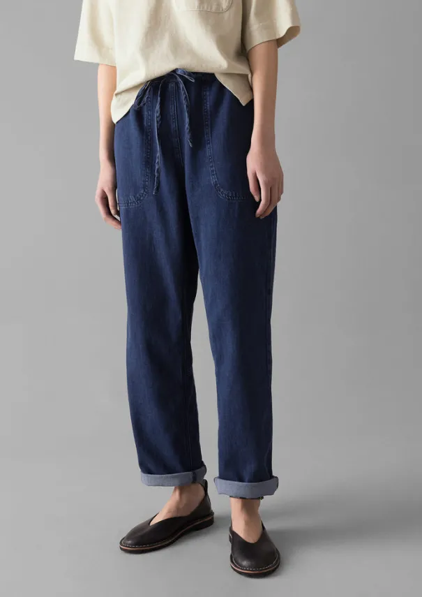 Inner leg panels reflect the workwear influences behind our Suki pants. Crafted from lightweight cotton denim containing recycled cotton fibres with a comfortable drawstring waist and finished with a single back patch pocket. Cotton denim containing recycled fibres. Drawstring waist. Side pockets. Back patch pocket. Inner leg panels. Cropped legs. Details Machine wash 30ºC. 100% cotton.Made in Turkiye.There may be some colour rub, so please keep away from light coloured fabrics and upholstery. Size & Fit Easy fit. Length: Ankle skimming. Waist: On the waist.Studio model Nova is 5ft 9in/175cm tall and is wearing a size S.