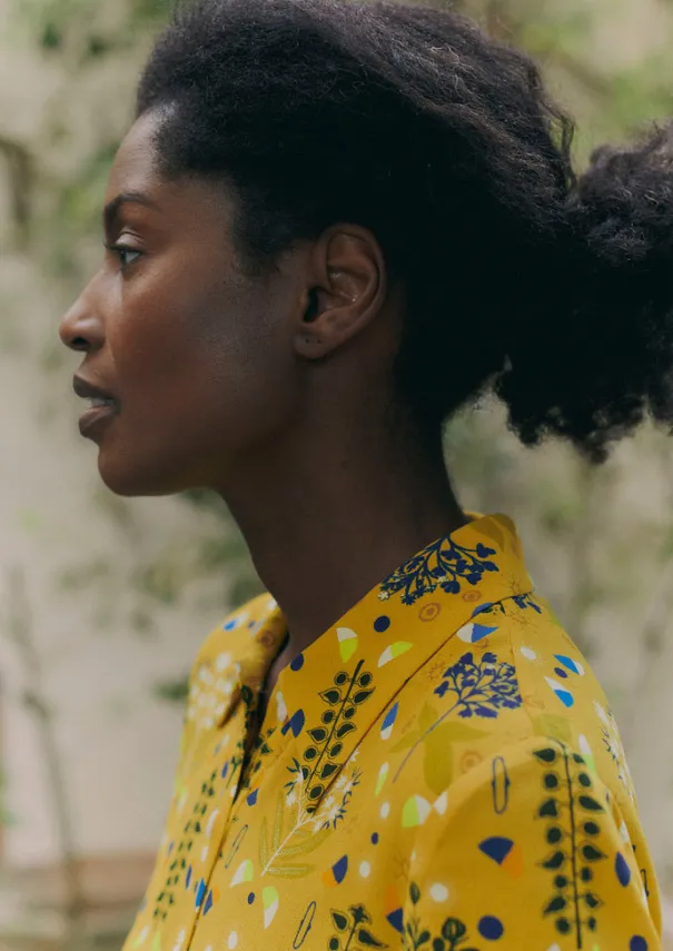 The collector print on our crepe dress is inspired by the botanical forms of contemporary artist Louise Despont. Cut to a fluid shape with darts at the waist and finished with a half placket accented by corozo buttons. Our dress has a closer fit on the hips and bust, and you may want to size up depending on your preference. Viscose crepe. Point collar. Chest darts. Mid-calf length. Half placket. Corozo buttons. Details Machine wash 30ºC. 100% viscose. Made in India. Size & Fit Fitted. Length: Mid calf. Sleeve: Short sleeve. Studio model Nova is 5ft 9in/175cm tall and is wearing a size 8.