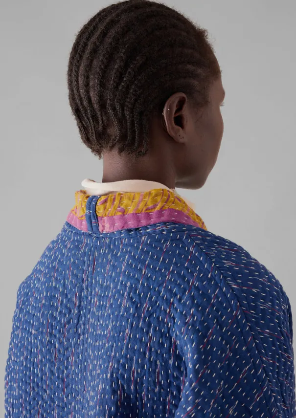 Our one-of-a-kind ikat jacket is kantha-stitched and sewn together from repurposed cotton saris by women in West Bengal who are part of two Fair Trade cooperatives. Cut to an easy dropped-shoulder shape with side pockets that can be pulled through to the other side, making it reversible. Each is unique, varying in pattern and colour. Repurposed ikat cotton and ikat cotton blend sari cloths. Reversible. Kantha-stitched. Dropped shoulders. Easy long sleeves. Side pockets. Side ties. Each is unique. Details Hand wash. 100% cotton.Made in India by small groups of women who work in collaboration with a fair trade organisation that supports them in business and marketing. Being hand made, no two are the same.Read more about the Making of Kantha. Size & Fit Easy fit. Length: Low hip. Sleeves: 3/4 length. Studio model Piath is 5ft 10in/178cm tall and is wearing a size XXS/XS.