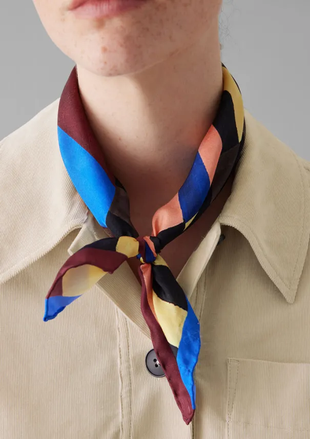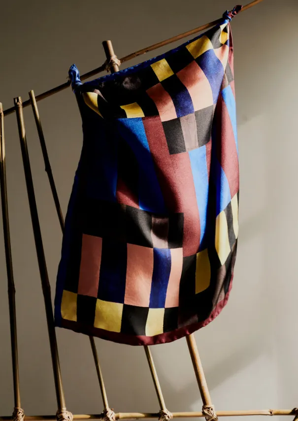 Printed bandana created in collaboration with British artist Isobel Harvey. The check print is inspired by the wings in her vibrant bird paintings. Crafted from a soft silk the scarf is cut using a pattern which limits fabric waste. Details Dry clean only. 100% silk. Made in the United Kingdom.Silk yarns are very delicate. Please protect the item from sharp objects or jewellery that may catch or snag, and avoid any drops or splashes of liquid as they may leave marks.47 x 47cm.