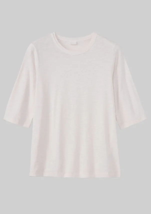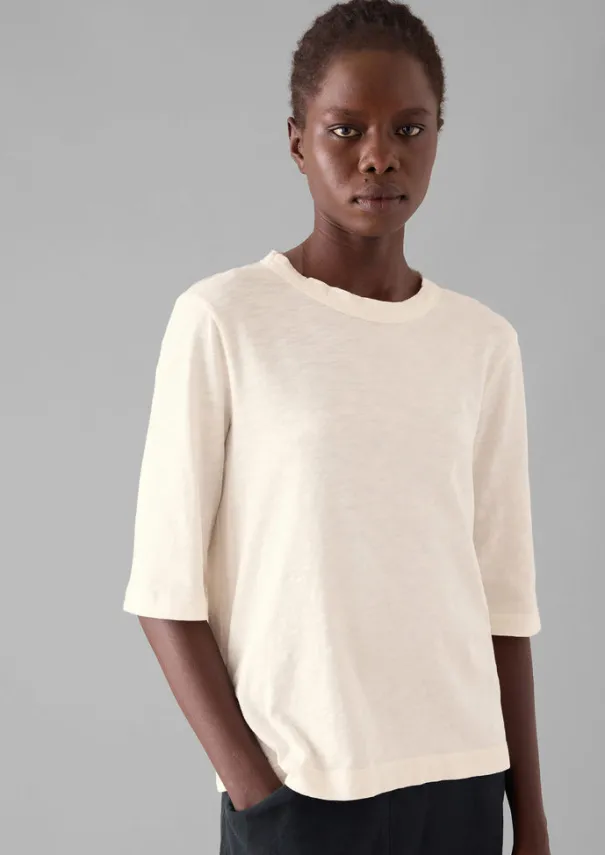 Our simple Cleo tee is crafted from lightweight slubby organic cotton jersey which is soft to the touch. Crafted in Portugal to a straight shape with a bound crew neckline and elbow-length sleeves which are set in at the shoulders. The tee is garment dyed, a process that gives each piece a washed, crumpled texture and natural colour variations. Lightweight slubby organic cotton jersey. Garment-dyed. Bound crew neck. Set-in elbow-length sleeves. Twin-needle-stitched edges. Details Machine wash 30ºC gentle cycle. 100% organic cotton.Made in Portugal.These cotton fibres have been grown in a chemical and pesticide free environment.Variations/unevenness of colour and gradual fading are characteristic of garment dyeing. The light coloured base of the fabric may show occasionally at stitching points, this should not be considered a defect. Size & Fit Regular fit. Length: Low hip. Sleeve: Elbow length. Neck: Crew.Studio model Piath is 5ft 10in/178cm tall and is wearing a size S.