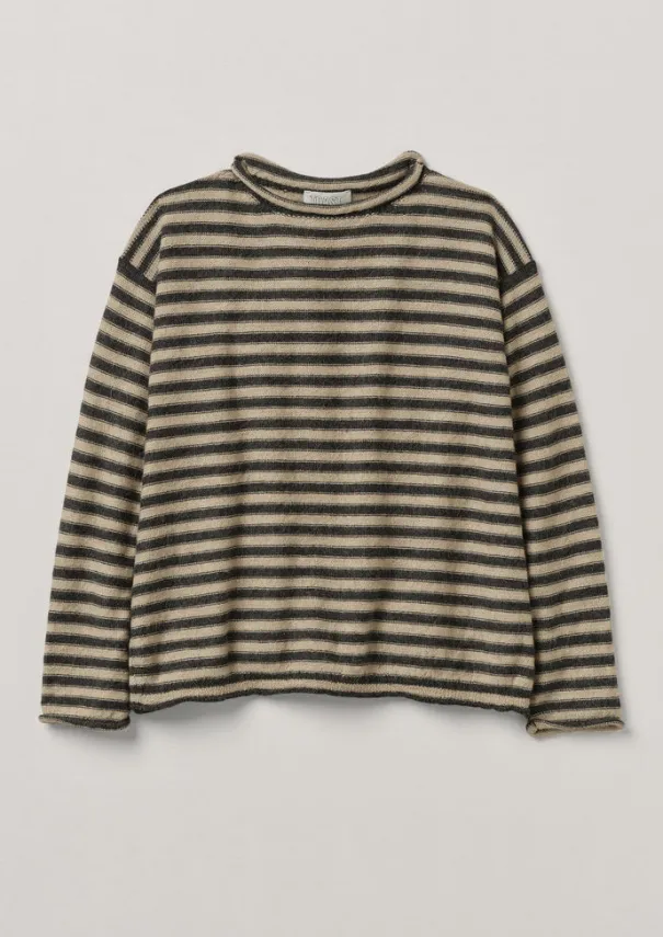 Our sweater is knitted from a blend of fine alpaca and organic wool fibres, which are undyed. Patterned with intarsia striped and shaped with dropped sleeves, then finished with rolls at the wide neckline and cuffs. Undyed alpaca and organic wool blend. Intarsia stripes. High wide neck. Roll-edged neck and cuffs. Dropped sleeves. Side hem slits. Ribbed hem. Details Hand wash. 50% alpaca wool, 50% wool. Made in Portugal. Soft yarns are liable to pill to some extent, even when using those of the best quality. To take good care of them remove any pills using a pilling comb and protect them from sharp items or jewellery that may catch or snag. Size & Fit Easy fit. Length: Mid hip. Sleeves: Full length. Neckline: Wide/open crew. Studio model Maggie is 5ft 8in/172cm tall and is wearing a size S.