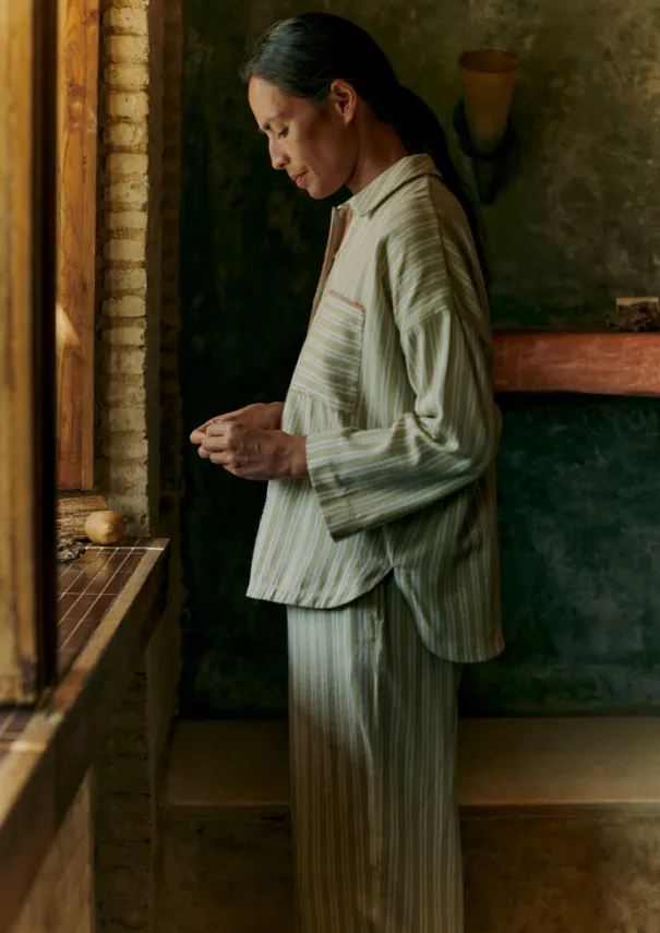 Our pyjamas are made in India from striped cotton flannel, which is brushed for softness. The top has easy dropped shoulders and a curved hem, while the trousers have an elasticated waist with a herringbone drawstring. Striped organic cotton flannel. Top: Collar. Button down-front. Patch pocket. Dropped shoulder. Curved hem. Corozo buttons. Trousers: Elasticated drawstring waist. Side seam pockets. Details Machine wash 40ºC gentle cycle. 100% cotton. Made in India. Size & Fit Easy fit. Length: Top thigh. Waist: Below waist. Sleeve: Bracelet length. Studio model Nova is 5ft 9in/175cm tall and is wearing a size S.