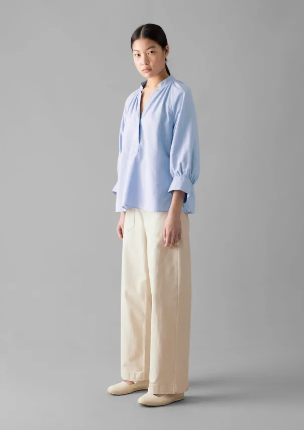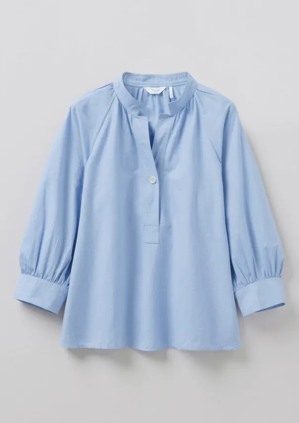 Our effortless shirt is crafted from soft, lightweight cotton oxford which is comfortable against the skin. Shaped with a band collar and raglan sleeves, with delicate gathers for a feminine note. Lightweight cotton oxford. Band collar. Raglan sleeves. Gathered cuffs. Side hem slits. Corozo buttons. Details Machine wash 30ºC. 100% cotton.Made in India. Size & Fit Easy fit. Length: Mid hip. Sleeves: 3/4 length.Studio model Nova is 5ft 9in/175cm tall and is wearing a size S.