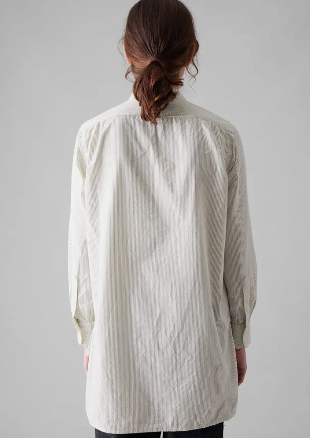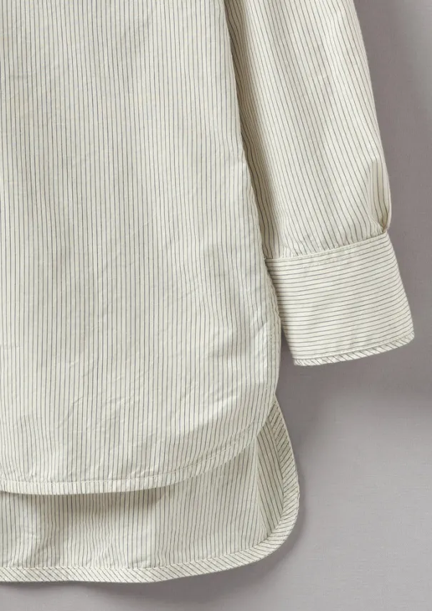 Our pared-back Taro shirt is cut to a longer length for effortless layering. Crafted from striped organic cotton with a pleat beneath the half button placket, for movement through the curved step hem. Striped cotton. Long cut. Grandad collar. Chest patch pocket. Gathered cuffs. Front pleat. Curved step hem. Top-thigh length. Concealed-button half placket. Details Machine wash 30ºC. 100% cotton.Made in China. Size & Fit Regular fit. Length: Top thigh. Sleeve: Full length.Studio model Maggie is 5ft 8in/172cm tall and is wearing a size 8.