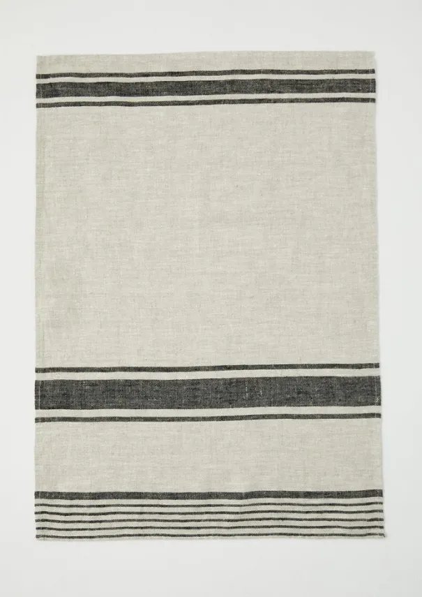 Good quality, absorbent, washed linen tea towel with an irregular yarn-dyed stripe. Cotton herringbone hanging loop. Woven by a traditional Lithuanian mill.DetailsMachine wash. 100% linen.Made in Lithuania. 65 x 46cm.