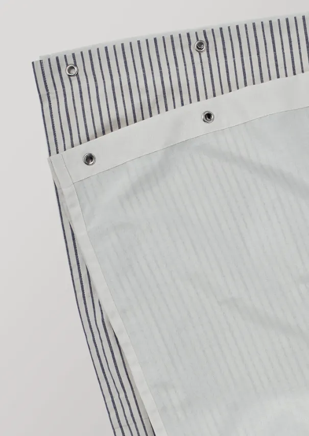 Double-layered shower curtain, with the outer made from pyjama stripe organic cotton and the waterproof inner made from recycled plastic bottles. With stainless steel eyelets and a coordinating bag for storage. Please ensure that the waterproof inner is kept in the bath or shower basin and the cotton outer kept away from the lining to stay dry and prevent mould. Details Machine wash 60ºC. Lining: 100% polyester. Outer shell: 100% organic cotton.Made in India.W 184cm x L 180cm.