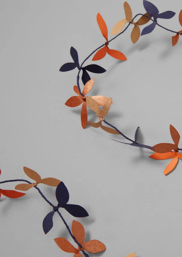 A thoughtful alternative to modern tinsel, our garland features flower-shaped leaves twisted on paper-wrapped wire. Handmade in India with metallic and matte leaves, the latter dyed with natural tea. The wire allows it to hold the desired shape when arranged. Founded in 1993, the small family-run factory supports deaf and blind artisans and ensures any scraps of paper are recycled. Keep away from fire. Details Cotton rag paper.Made in India.Approx. L 200cm.