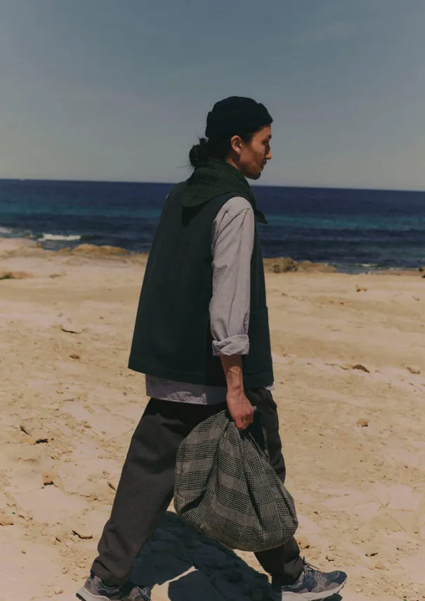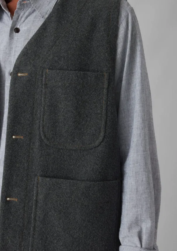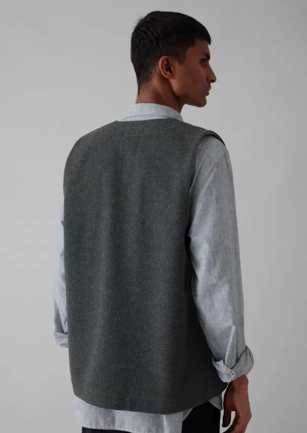 Our gilet is crafted from a virgin melton wool blend, with charcoal melange yarns bringing a natural variation in tone. Cut to a straight long-line shape with hip and chest pockets and unlined for ease of movement. Finished with contrast stitching and corozo buttons. Can be paired with the matching Melton Wool Chore Jacket for relaxed tailoring. Part of our Menswear collection. Melton wool blend. Hip and chest pockets. Contrast stitching. Unlined. Corozo buttons. Details Dry clean only. Body: 78% wool, 22% polyester. Facings: 100% cotton. Made in Romania. Size & Fit Easy fit. Length: Mid hip. Sleeve: Sleeveless. Studio model Lohit is 6ft 2in/189cm tall and is wearing a size M.