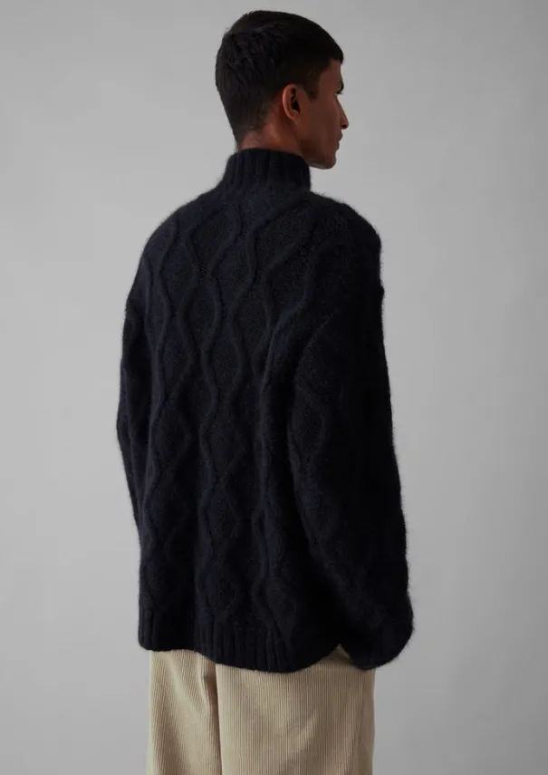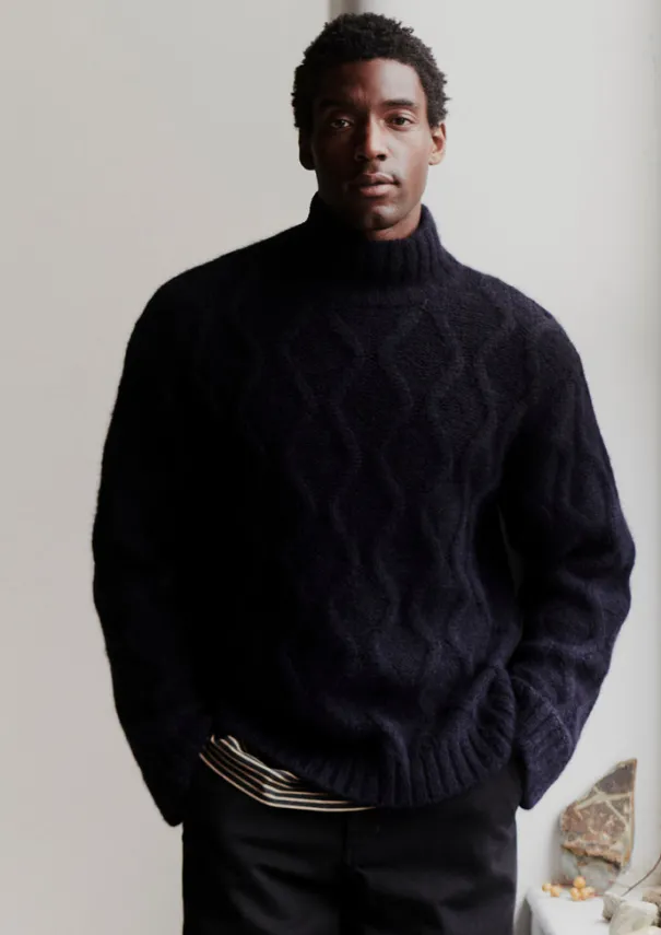 Our jumper is crafted from a superfine alpaca and merino wool blended with cotton. Knitted in Italy with a classic cable design to a relaxed shape with a roll neck. Superfine alpaca, merino wool and cotton blend. Roll neck. Ribbed edges. Rolled cuffs and hem. Details Hand wash. 55% alpaca wool, 35% cotton, 10% wool. Made in Romania.Soft yarns are liable to pill to some extent, even when using those of the best quality. To take good care of them remove any pills using a pilling comb and protect them from sharp items or jewellery that may catch or snag. Size & Fit Easy fit. Length: Low hip. Sleeve: Full length. Neck: Roll neck. Studio model Lohit is 6ft 2in/189cm tall and is wearing a size M.