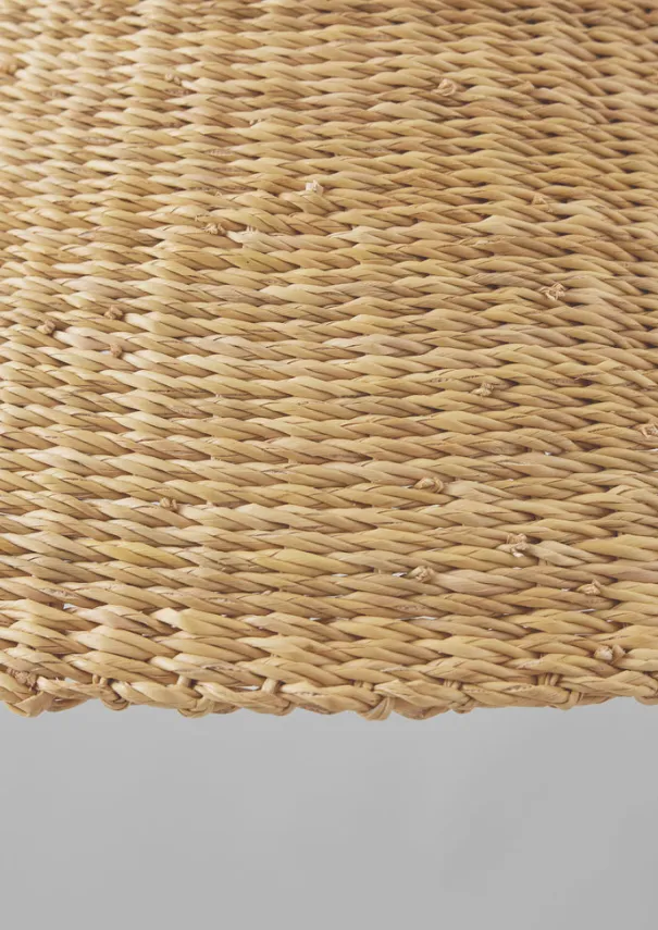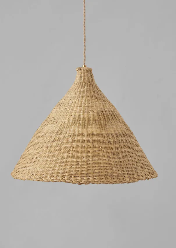 Cloche pendant shade handwoven by artisans in Ghana exclusively for TOAST, supported by Frafra Baskets. Made from Veta Vera grass which grows locally, also known as elephant grass. Shipped pressed inwards from the artisans in Ghana. To reshape it, simply sprinkle water on the entire basket, straighten it by hand and allow it to dry on a flat surface. Details Veta Vera glass. Gentle dust or damp cloth clean only.Suitable for indoor use and LED light bulbs only. Sold as a single pendant lampshade only, with no fitting included. When installing a new light fitting, always use a qualified electrician. Being handwoven each piece will slightly vary in shape and size.Made in Ghana.Being handmade, no two of our pieces will be alike. Each may come with pleasing variations and irregularities, recalling the hand of the maker.Approx. D 50cm x H 44cm.