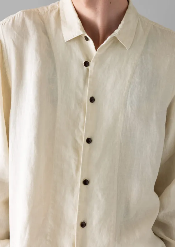 Our garment-dyed shirt features a single asymmetric rouleau loop fastening, interrupting the placket. Crafted from supple linen to a curved-hem shape with a small point collar. Part of our Menswear collection. Slubbed linen. Garment-dyed. Small point collar. Forward-sitting shoulder seams. Curved hem. Asymmetric loop. Corozo buttons. Details Machine wash 30ºC. 100% linen. Made in India.Variations/unevenness of colour and gradual fading are characteristic of garment dyeing. The light coloured base of the fabric may show occasionally at stitching points, this should not be considered a defect. Size & Fit Regular fit. Length: Mid hip. Sleeve: Full length.Studio model Theodor is 6ft 2in/188.5cm tall and wears a size M.