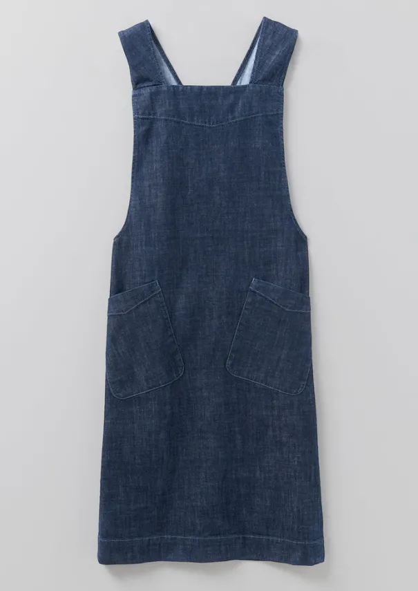 Apron in very good quality indigo denim with contrast stitching. Two wide straps cross over at back. Two patch pockets. Details Cool machine wash. 99% organic cotton, 1% elastane.Made in Turkiye.Length from centre front 97cm, width 92cm.Indigo dye is a very deep and intense dye so the fabric will fade a little with each wash to give a comfortable, worn appearance. Unfortunately, the downside of this is that there may be some colour rub when new – so please keep your new denim away from light coloured fabrics and upholstery.To keep your denim looking good it is best to wash inside out and to not use fabric softener. Always follow the washing instructions.Read more about The Making of Indigo.