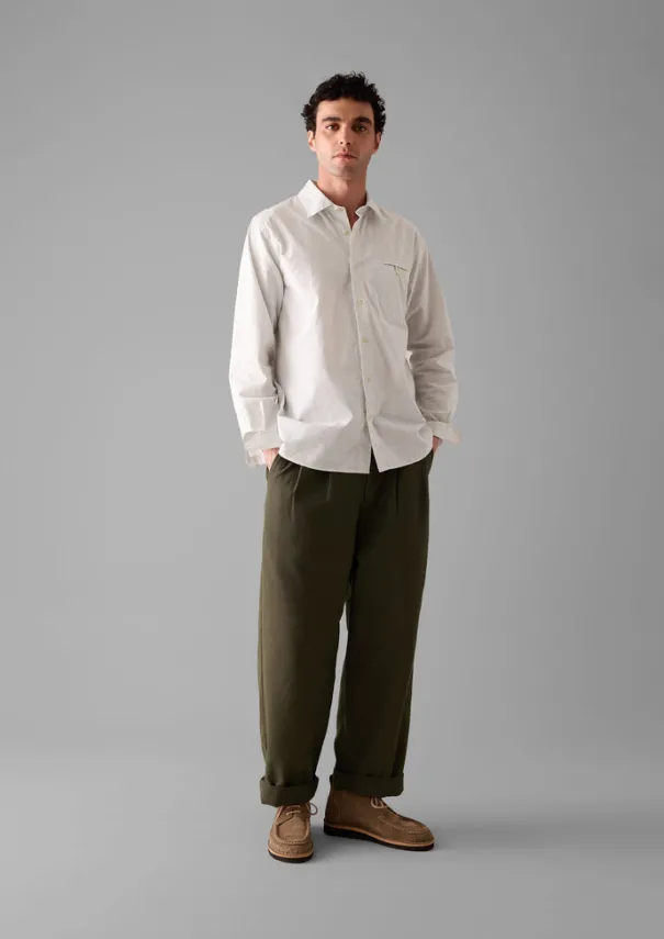 The buttoned chest jet pocket punctuating our shirt nods to a 1940s vintage piece. Crafted from cotton with slubby stripes to a point-collar shape, echoed by the pointed yoke panel at the back. Sewn just 20km away from where the cloth is woven, near Lordelo in Portugal. Part of our Menswear collection. Slubbed striped cotton. Point collar. Forward-sitting shoulders. Buttoned chest jet pocket. Buttoned cuffs. Pointed back yoke panel. Inverted box pleat. Curved hem. Corozo buttons. Details Machine wash 30ºC. 100% cotton. Made in Portugal. Size & Fit Regular fit. Length: Low hip. Sleeves: Full length. Neckline: Polo neck. Studio model Dylan is 6ft 1in/186cm tall and wears a size M.
