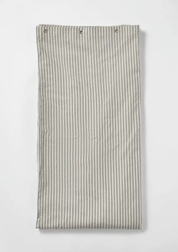Double-layered shower curtain, with the outer made from ticking stripe organic cotton and the waterproof inner made from recycled plastic bottles. With stainless steel eyelets, a weighted hem and a coordinating bag for storage. Details Machine wash 60ºC. Outer shell: 100% organic cotton. Lining: 100% polyester.Made in India.These cotton fibres have been grown in a chemical and pesticide free environment.W 184cm x L 180cm.