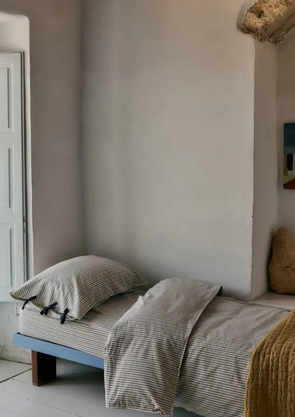 Traditional woven bed linen in soft, weighty, organic cotton with a classic pyjama stripe. Two rows of satin stitch along the edge of the sheet. Details Machine wash. 100% organic cotton.Made in India. To fit bed 135 x 190cm, mattress depth 28cm. To fit bed 150 X 200cm, mattress depth 28cm. To fit bed 180 x 200cm, mattress depth 28cm. 180 Thread Count.