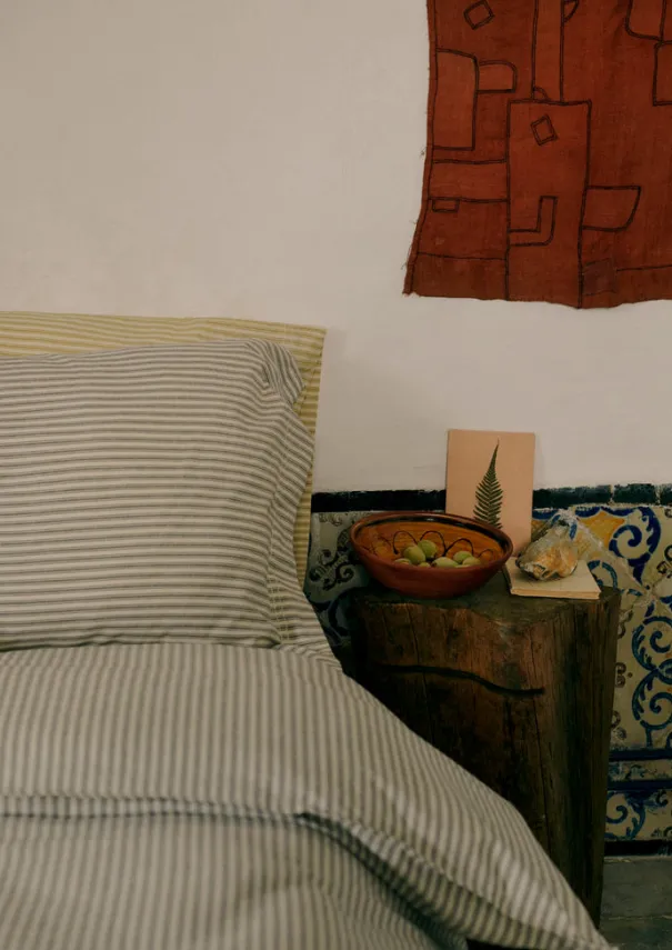 Traditional woven ticking stripe bed linen in soft, weighty, organic cotton. Plain stitching trim along duvet cover, with mother of pearl button closure. Details Machine wash. 100% organic cotton.Made in India. These cotton fibres have been grown in a chemical and pesticide free environment.Single W 140 x L 200cm. Double W 200 x L 200cm. King W 225 x L 220cm. Super King W 260 x L 220cm. 180 thread count.
