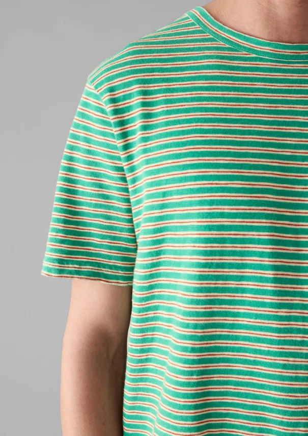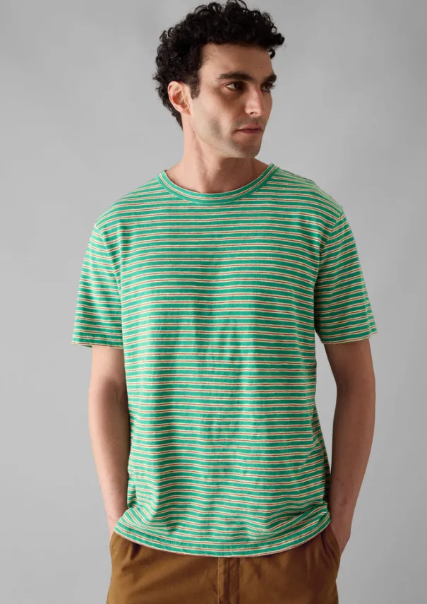 Our Theo tee is crafted in Portugal from slubby organic cotton jersey with wide yarn-dyed stripes. Shaped with a round neckline, traced by a defined stripe. Part of our Menswear collection. Slubbed organic cotton jersey. Yarn-dyed stripe. Round neck. Details Machine wash 30ºC. 100% cotton. Made in Portugal. Size & Fit Regular fit. Length: Mid hip. Sleeve: Short sleeve. Neck: Crew neck.Studio model Dylan is 6ft 1in/186cm tall and wears a size M.