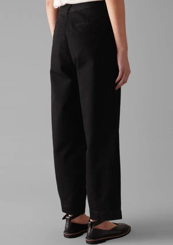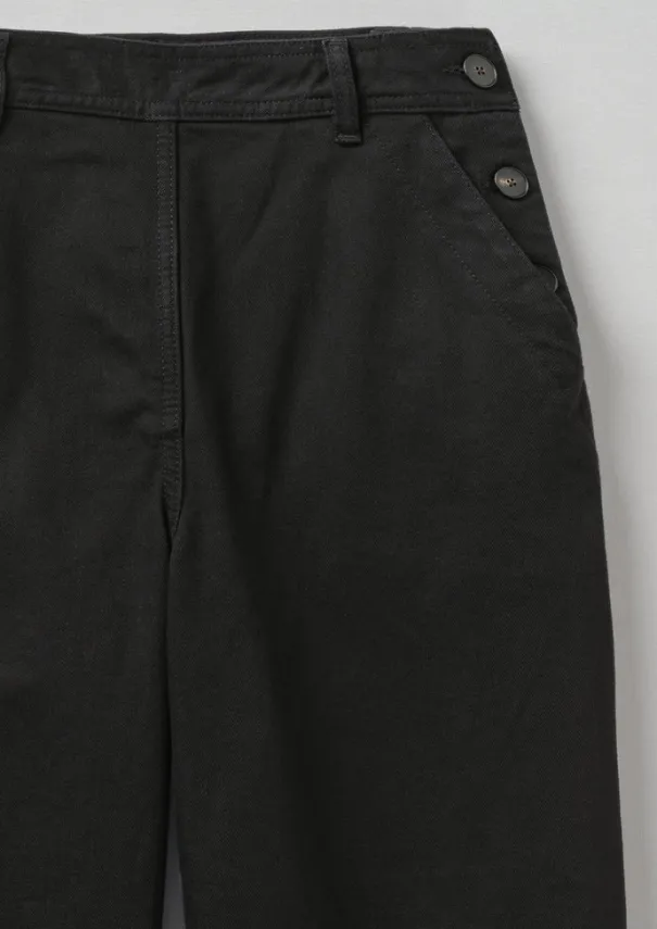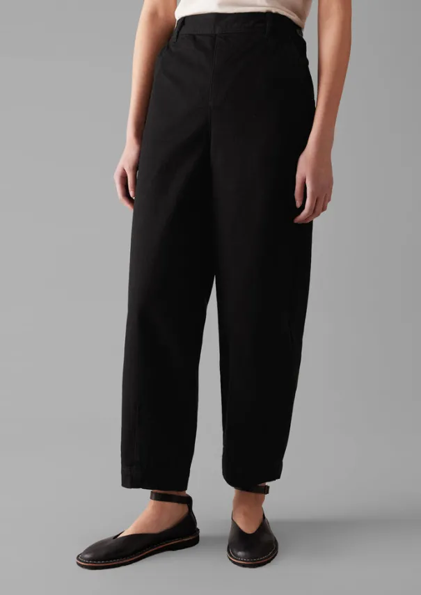 Our trousers are crafted from cotton denim which becomes more supple with each wear. Sitting neatly on the waist with a flat front, falling to rounded long-cropped legs, then finished with a large horn buttons at the side. Cotton denim. Belt loops. Side pockets. Back jet pockets. Long-cropped balloon-shaped legs. Side horn buttons. Details Machine wash 30ºC gentle cycle. 98% cotton, 2% elastane. Made in Turkiye. Black denim will subtly fade overtime with wash and wear. Wash separately inside out for best results. Size & Fit Regular fit. Length: Crop. Waist: Below waist.Studio model Kelia is 5ft 8in/173cm tall and is wearing a size 8.