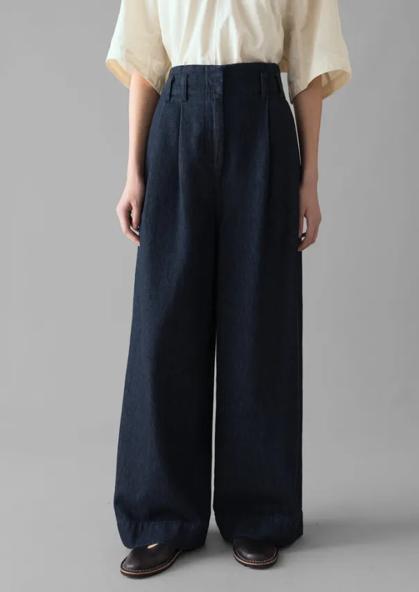 Double reverse-facing pleats bring texture and volume to the wide legs of our denim trousers. Crafted from hemp blended with cotton and finished with a front zip and corozo button. Hemp and cotton-blend denim. Belt loops. Side pockets. Double reverse-facing pleats. Front zip and corozo button. Details Machine wash 30ºC. 91% cotton, 9% hemp. Made in Turkey.There will be colour rub when new but with wash and wear the indigo will fade subtly and beautifully. Size & Fit Regular fit. Length: Full length. Waist: On the waist. Studio model Nova is 5ft 9in/175cm tall and is wearing a size 8.