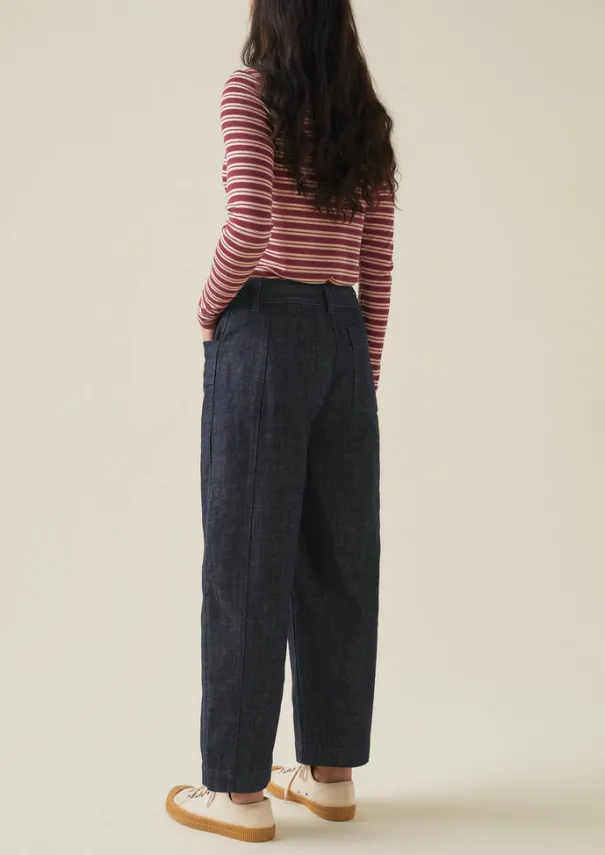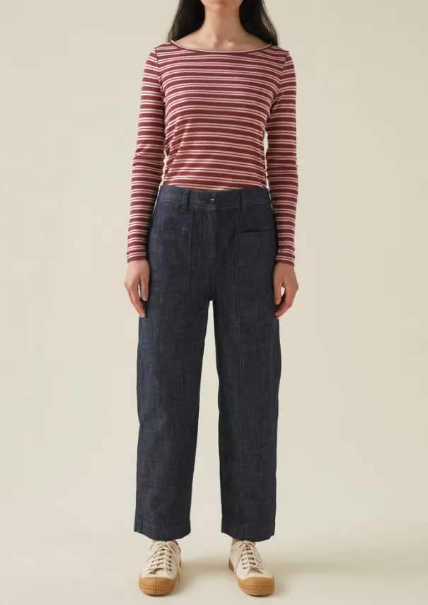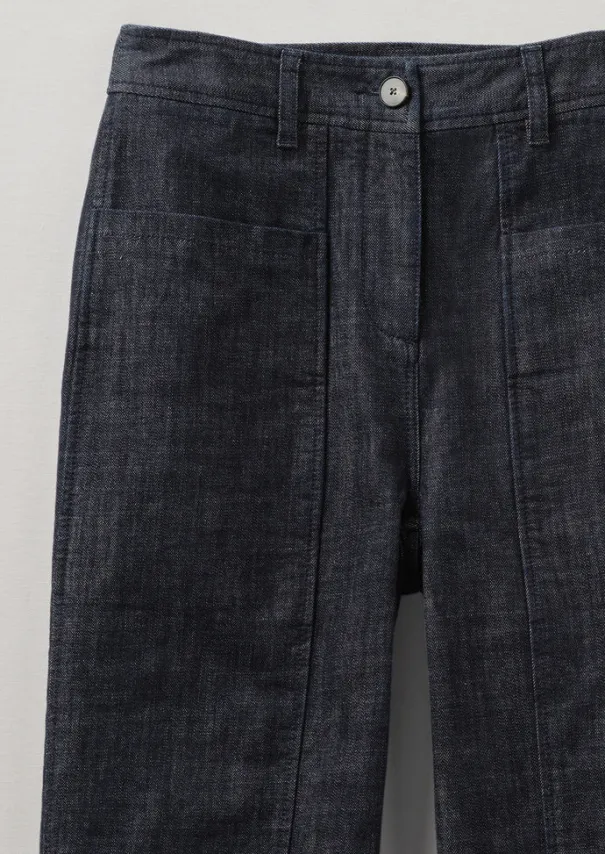 Our trousers feature top-access pockets which complement the panelled construction. Crafted from organic cotton denim dyed with a technique that uses up to 70% less water than regular processes. Cut to a tapered shape, then finished with a single back patch pocket. Organic cotton cord. Belt loops. Side top-access pockets. Back patch pocket. Panelled tapered legs. Lower-calf length. Zip and corozo button. Details Machine wash 30ºC. 98% cotton, 2% elastane. Made in Turkiye. This piece is finished with corozo buttons, which do not contain any parts of animal origin. There may be some colour rub, so please keep away from light coloured fabrics and upholstery. These cotton fibres have been grown in a chemical and pesticide free environment. Size & Fit Regular fit. Length: Crop. Waist: On the waist. Outside leg length for size 8 is 99cm. Studio model Kelia is 5ft 8in/173cm tall and is wearing a size 8.