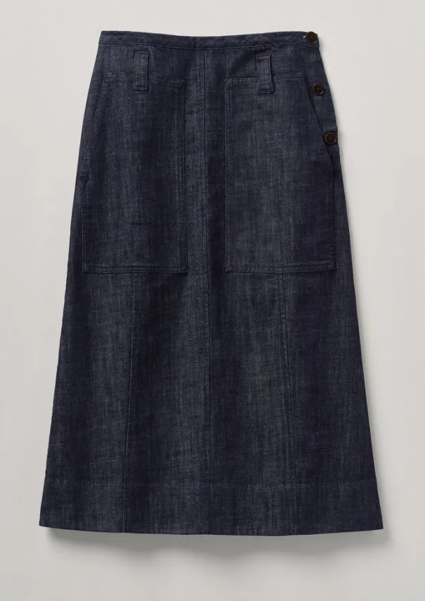 Our effortless skirt is cut to a soft A-line shape for a sense of ease, then punctuated by large side patch pockets. Crafted from organic cotton denim dyed with a technique that uses up to 70% less water than regular processes. Organic cotton denim. Large side patch pockets. Lower-calf length. Corozo button. Hook and bar. Details Machine wash 30ºC. 98% cotton, 2% elastane.Made in Turkiye. This piece is finished with corozo buttons, which do not contain any parts of animal origin. There may be some colour rub, so please keep away from light coloured fabrics and upholstery. These cotton fibres have been grown in a chemical and pesticide free environment. Size & Fit Regular fit. Length: Lower calf. Waist: On the waist.Studio model Kelia is 5ft 8in/173cm tall and is wearing a size 8.