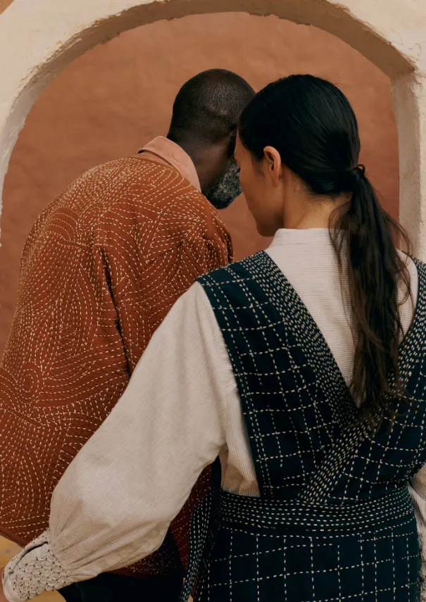 Our pinafore is hand kantha-stitched by artisan embroiderers in India in a pattern reminiscent of lines on a map. Crafted from crimped cotton and cut to a V-neck, then finished with a wrap front. Kantha-stitched. Crimped cotton. Side pockets. Waist darts. Wrap-around front. Details Dry clean only. 100% cotton. Embroidery: 100% recycled polyester. Made in India.Created using a combination of artisanal craft and modern techniques, in line with our vision to help preserve traditional methods.Fine hand embroidery is very delicate. Please protect the item from jewellery or other sharp objects that may pull the threads. Size & Fit Regular fit. Length: Mid calf. Sleeve: Sleeveless. Studio model Nova is 5ft 9in/175cm tall and is wearing a size 8.