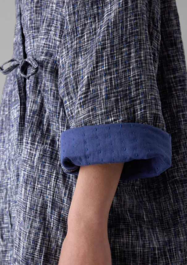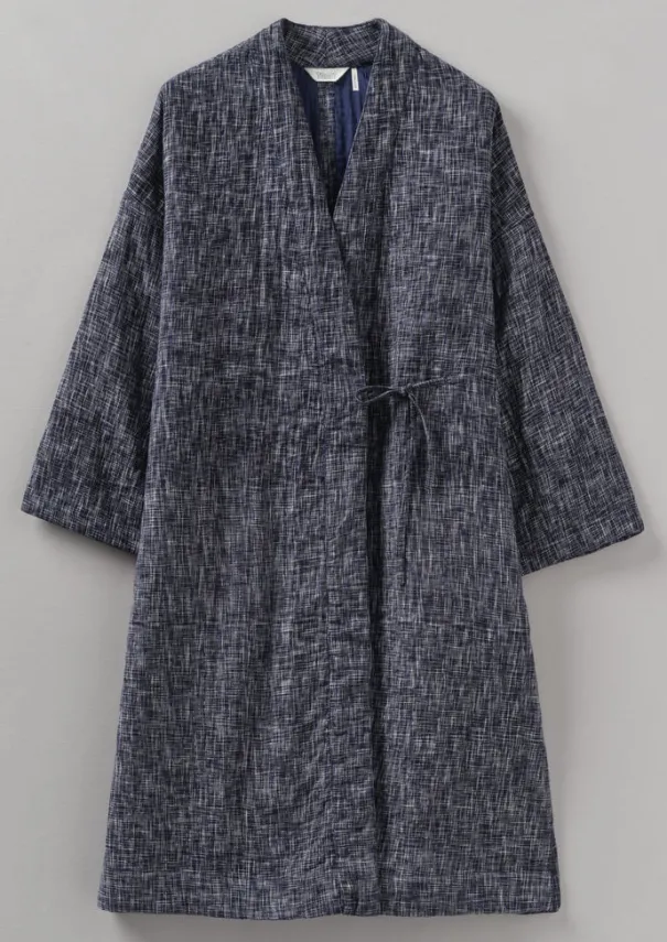 Our kantha gown is made with a handloom woven cotton outer. For warmth, the inner wadding is made from two layers of repurposed cotton saris, which are kantha-stitched and sewn together by women artisans who are part of two Indian cooperatives. The inside is finished with a light cotton lining. Shaped with a centre back seam for ease of movement and dropped shoulders, finished with side ties. Weaving irregularities are a pleasing characteristic of handloom woven items and should not be considered a fault. Hand-woven cotton. Repurposed cotton sari wadding. Kantha-stitched. Dropped shoulders. Side seam pockets. Side ties. Side splits. Details Hand wash. 90% cotton, 10% viscose. Made in India.Made in India by small groups of men and women who work in collaboration with a fair trade organisation that supports them in business and marketing. Being hand made, no two are the same. Size & Fit Oversized. Length: Below knee. Sleeve: Bracelet length. Studio model Nova is 5ft 9in/175cm tall and is wearing a size S.