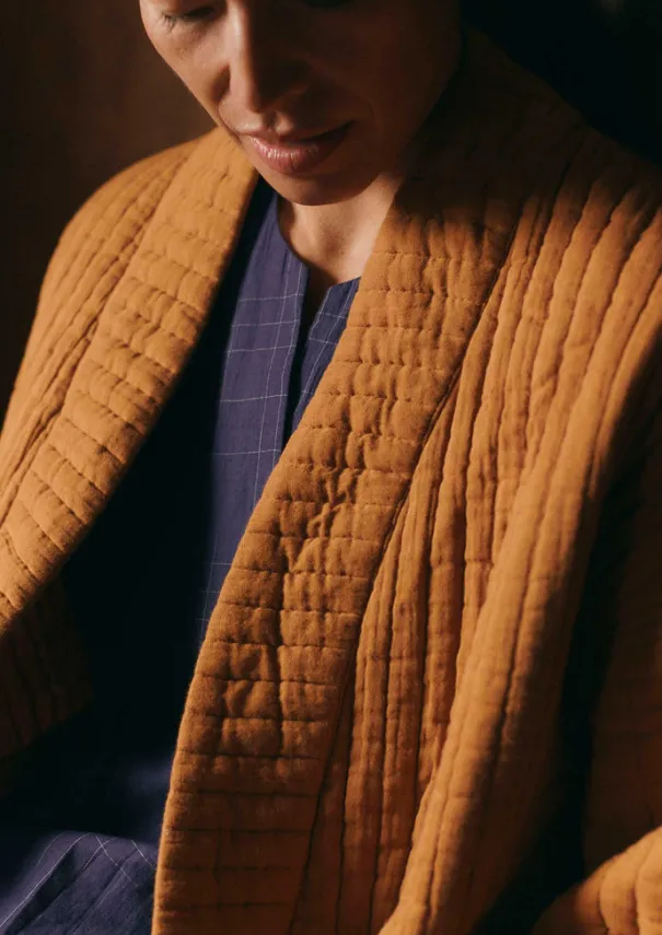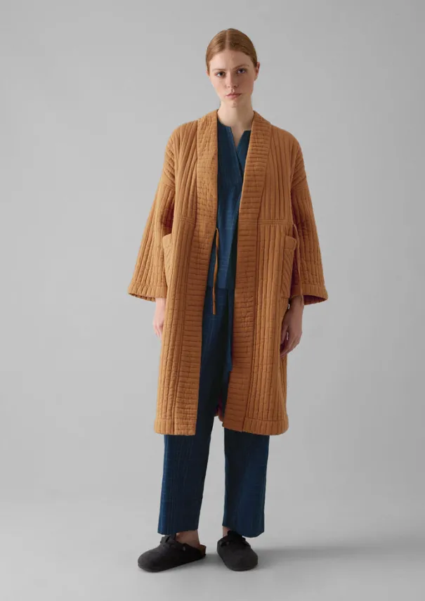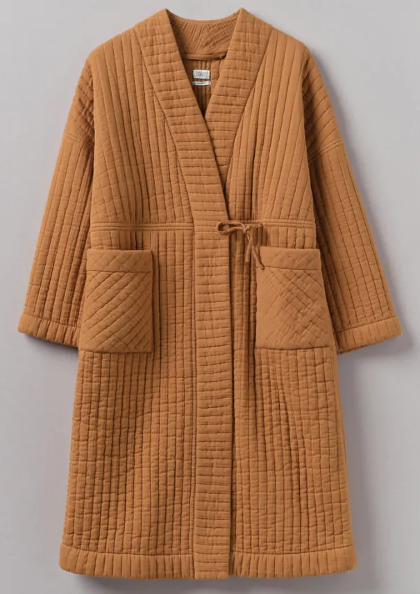 Heightening softness and comfort, our gown is quilted with recycled polyester wadding. Made from double-faced gauzy cotton to an easy shape, which is cinched in by the waist tie, then finished with side patch pockets. Quilted double-faced cotton. Recycled polyester wadding. Easy shape. Waist tie. Side patch pockets. Panelled seam detail. Internal hanging loop. Details Machine wash 30ºC gentle cycle. 100% cotton. Wadding: 100% recycled polyester. Made in India. Size & Fit Oversized. Length: Upper calf. Sleeve: Wristbone length. Studio model Haley is 5ft 9in/175cm tall and is wearing a size S/M.