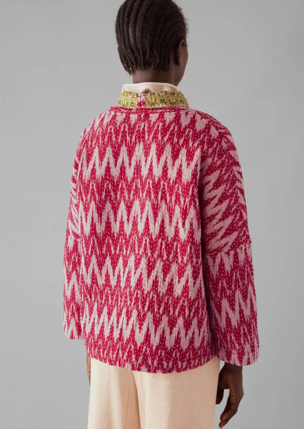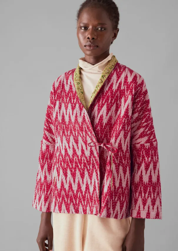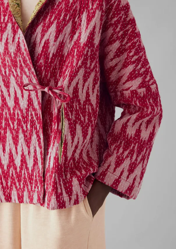 Our one-of-a-kind ikat jacket is kantha-stitched and sewn together from repurposed cotton saris by women in West Bengal who are part of two Fair Trade cooperatives. Cut to an easy dropped-shoulder shape with side pockets that can be pulled through to the other side, making it reversible. Each is unique, varying in pattern and colour. Repurposed ikat cotton and ikat cotton blend sari cloths. Reversible. Kantha-stitched. Dropped shoulders. Easy long sleeves. Side pockets. Side ties. Each is unique. Details Hand wash. 100% cotton.Made in India by small groups of women who work in collaboration with a fair trade organisation that supports them in business and marketing. Being hand made, no two are the same.Read more about the Making of Kantha. Size & Fit Easy fit. Length: Low hip. Sleeves: 3/4 length. Studio model Piath is 5ft 10in/178cm tall and is wearing a size XXS/XS.