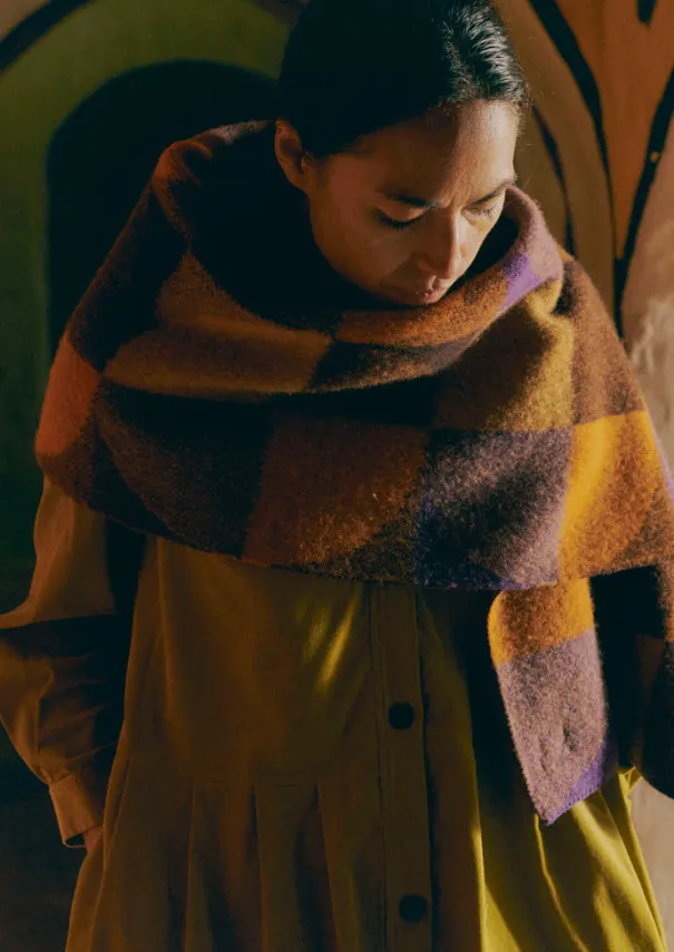 Our warm and vibrant colour-block scarf is knitted in Scotland from UK-spun wool by a company which traces back to 1845. With a jacquard pattern that makes it reversible, and a soft, gently felted and brushed finish. Details Hand wash. 100% wool. Made in the United Kingdom.Soft yarns are liable to pill to some extent, even when using those of the best quality. To take good care of them remove any pills using a pilling comb and protect them from sharp items or jewellery that may catch or snag.Length is 180cm.