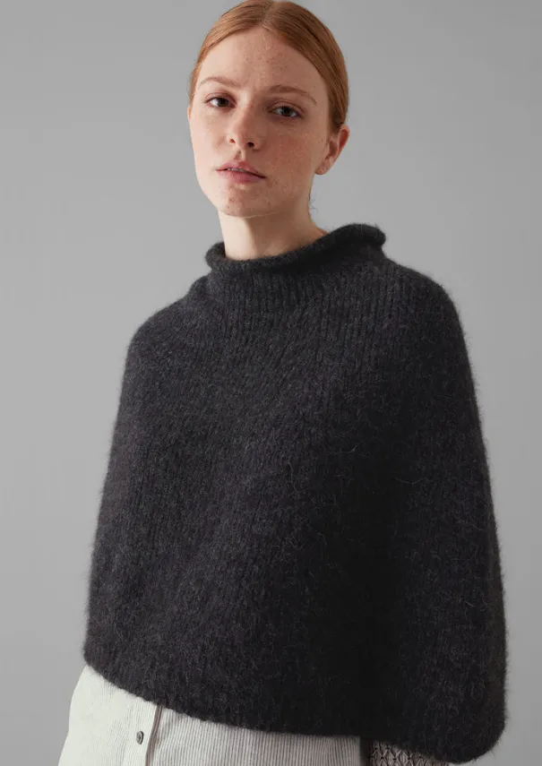 Our cocooning, seamless poncho is knitted in the round from a lofty blend of alpaca, merino wool and cotton. The high neck has a rolled edge, while the hem is ribbed. Details Hand wash. 55% alpaca wool, 35% cotton, 10% merino wool. Made in Portugal.Soft yarns are liable to pill to some extent, even when using those of the best quality. To take good care of them remove any pills using a pilling comb and protect them from sharp items or jewellery that may catch or snag. Size & Fit Regular fit. Length: Crop. Neck: High neck. Length from side neck point is 46cm.