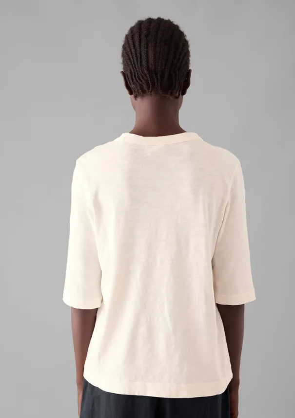 Our simple Cleo tee is crafted from lightweight slubby organic cotton jersey which is soft to the touch. Crafted in Portugal to a straight shape with a bound crew neckline and elbow-length sleeves which are set in at the shoulders. The tee is garment dyed, a process that gives each piece a washed, crumpled texture and natural colour variations. Lightweight slubby organic cotton jersey. Garment-dyed. Bound crew neck. Set-in elbow-length sleeves. Twin-needle-stitched edges. Details Machine wash 30ºC gentle cycle. 100% organic cotton.Made in Portugal.These cotton fibres have been grown in a chemical and pesticide free environment.Variations/unevenness of colour and gradual fading are characteristic of garment dyeing. The light coloured base of the fabric may show occasionally at stitching points, this should not be considered a defect. Size & Fit Regular fit. Length: Low hip. Sleeve: Elbow length. Neck: Crew.Studio model Piath is 5ft 10in/178cm tall and is wearing a size S.