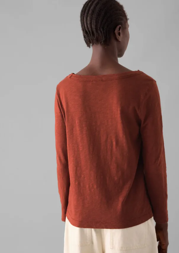 Our tee is crafted from cotton jersey with a slubbed texture in Portugal. Cut with a boat neckline and bracelet-length sleeves, then garment-dyed for a rich depth of colour. The tee is garment-dyed, a process that gives each piece a washed, crumpled texture and natural colour variations. Slubbed cotton jersey. Garment-dyed. Boat neckline. Bracelet-length sleeves. Mid-hip length. Details Machine wash 30ºC gentle cycle. 100% cotton. Made in Portugal.These cotton fibres have been grown in a chemical and pesticide free environment.Variations/unevenness of colour and gradual fading are characteristic of garment dyeing. The light coloured base of the fabric may show occasionally at stitching points, this should not be considered a defect. Size & Fit Regular fit. Length: Mid hip. Sleeve: Bracelet length. Neck: Boat neck.Studio model Piath is 5ft 10in/178cm tall and is wearing a size S.