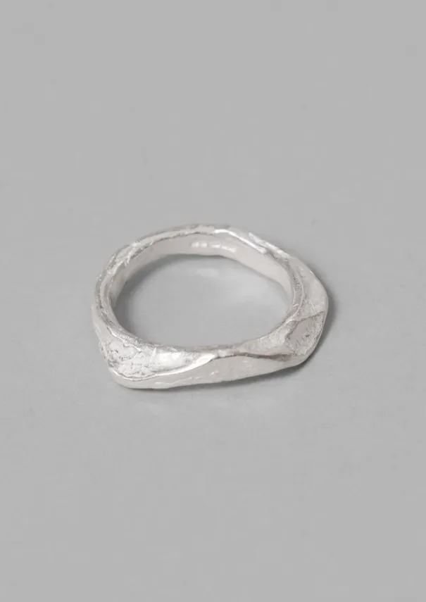 Sculptural ring by Emily Nixon which is handcrafted in Cornwall using the lost wax-casting method, where metal is poured into a mould made from a wax model. Shaped from sterling silver to an irregular band with a textured surface inspired by weathered rocks on the shoreline. Details Made from 100% 925 recycled silver.Sterling silver does naturally tarnish over time when in contact with the elements/moisture, so when unworn we advise keeping it in a box or the cotton drawstring bag we package the jewellery in. Made in the United Kingdom.S fits ring size J, M fits ring size M, L fits ring size Q.