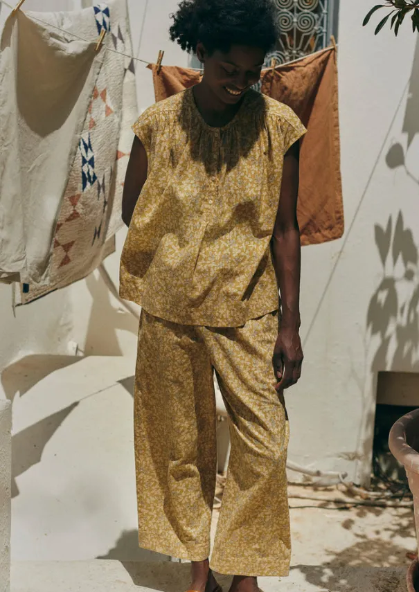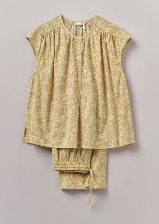 A collage floral print brings a touch of romance to our pyjamas, which are crafted from organic cotton. The top has gathers along the shoulder seam and neckline, while the trousers have a stitched cuff detail on the trouser hems and a comfortable elasticated drawstring waist. Printed organic cotton. Top: Gathered neck, shoulders and back. Side splits. Corozo buttons. Trousers: Elasticated drawstring waist. Side seam pockets. Stitch detail on hem. Details Machine wash 40ºC gentle cycle. 100% cotton. Made in India.This fabric has been screen printed by hand. Each piece is unique and colours and texture will vary. These irregularities are characteristic of this lovely print method and are not considered faults. Size & Fit Easy fit. Length: Low hip. Waist: On the waist. Sleeve: Cap. Studio model Nova is 5ft 9in/175cm tall and is wearing a size S.