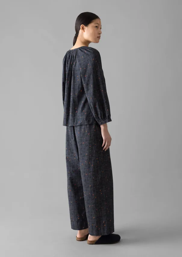 A trellis floral pattern is block-printed on our pyjamas by artisans in India. Crafted from cotton, the top has gathers at the band collar and cuffs, while the trousers have an elasticated drawstring waist with herringbone ties. Block-printed cotton. Top: Band collar. Gathered neck and cuffs. Raglan sleeves. Trousers: Elasticated drawstring waist. Herringbone ties. Side seam pockets. Details Machine wash 30ºC gentle cycle. 100% cotton. Made in India.Printed by hand using a traditional block print. A little unevenness in colour and design is characteristic of this hand process. Size & Fit Easy fit. Length: Low hip. Waist: On the waist. Sleeve: Bracelet length. Studio model Nova is 5ft 9in/175cm tall and is wearing a size S.