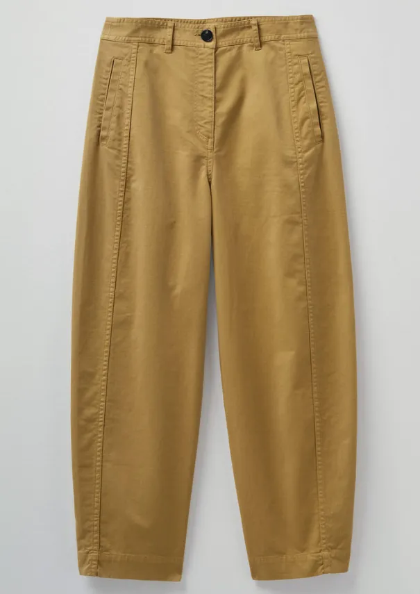 Our flat front trousers have side panels for a nod to workwear pieces. They’re crafted from hardwearing cotton twill with neat side welt pockets, then finished with a single back patch pocket. Sitting just below the waist, falling to cropped legs. Cotton twill. Garment-dyed. Belt loops. Side welt pockets. Back patch pocket. Side panels. Cropped legs. Concealed zip. Horn button. Details Machine wash 30ºC. Body: 98% cotton, 2% elastane. Lining: 100% cotton.Made in Portugal.Variations/unevenness of colour and gradual fading are characteristic of garment dyeing. The light coloured base of the fabric may show occasionally at stitching points, this should not be considered a defect. Size & Fit Regular fit. Length: Crop. Waist: Below waist.The specific garment-dye process for this style results in slight variation of fit from piece to piece.Studio model Kelia is 5ft 8in/173cm tall and is wearing a size 8.
