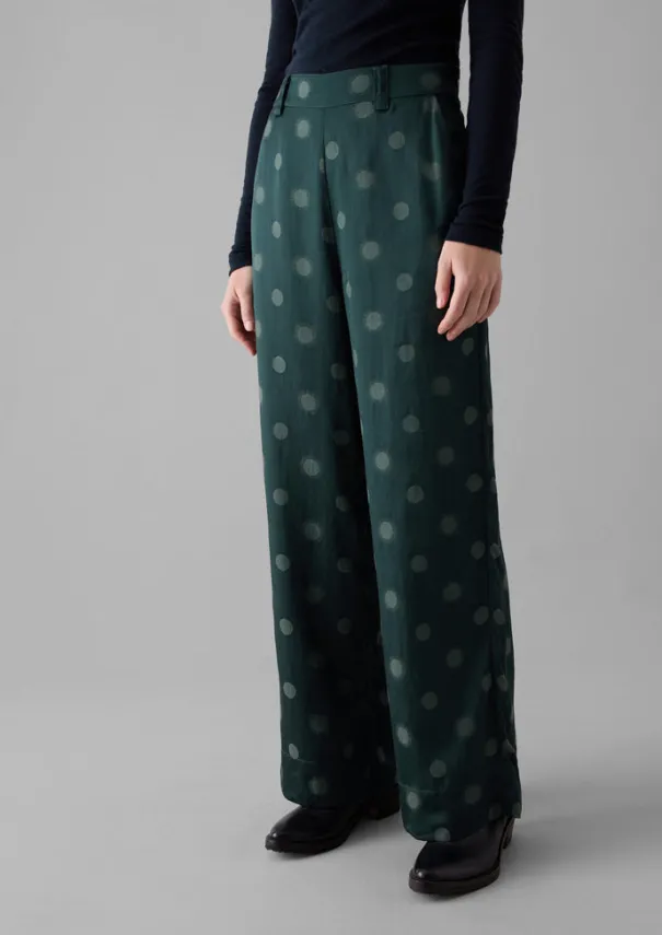 Our trousers are made from a linen and cotton blend, woven with jacquard sun and moon motifs. The fluid style is defined with front pleats and finished with belt loops. Jacquard linen, cotton and viscose blend. Slanted side pockets. Back patch pockets. Belt loops. Details Machine wash 30ºC gentle cycle. Body: 54% viscose, 28% cotton, 18% linen. Pocket bags: 100% viscose. Made in China. Size & Fit Regular fit. Length: Ankle skimming. Waist: On the waist. Studio model Haley is 5ft 9in/175cm tall and is wearing a size 8.